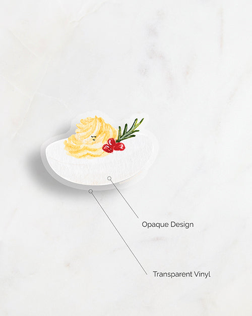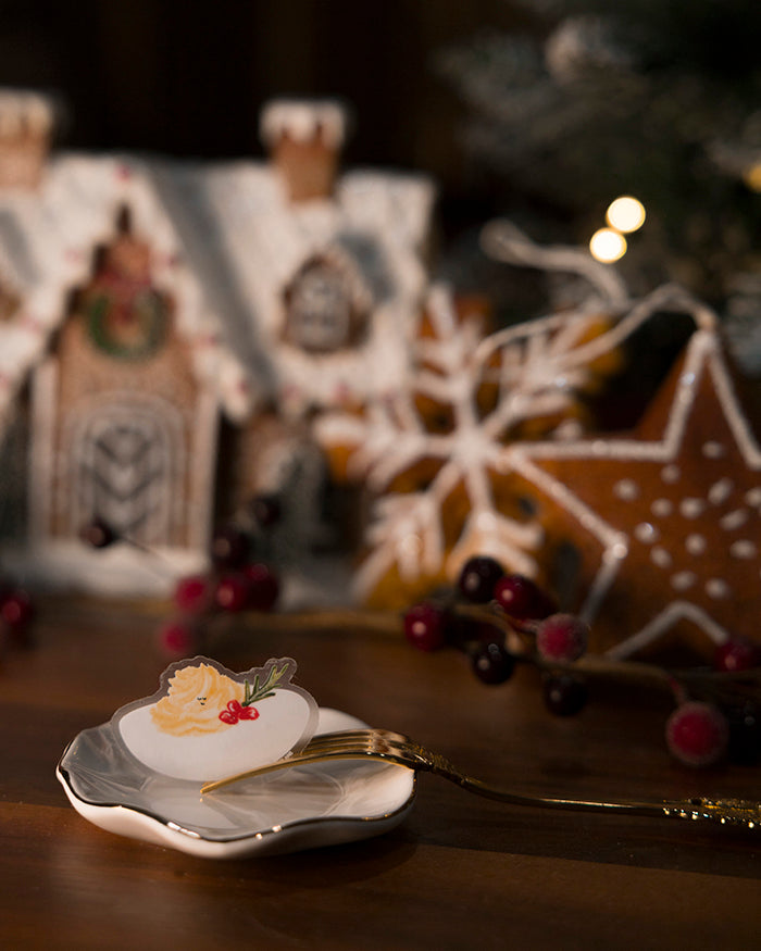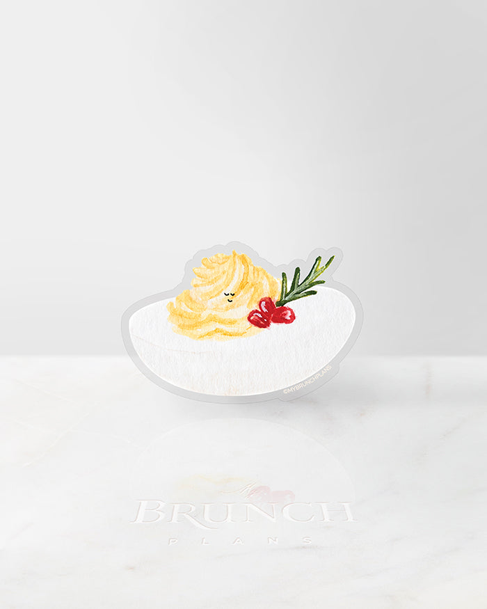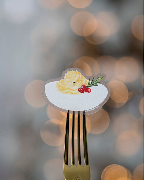 The classic deviled egg adorned with rosemary and pomegranates- nice enough to stick along where ever you put it, but still on the naughty list for it's devilish cuteness.