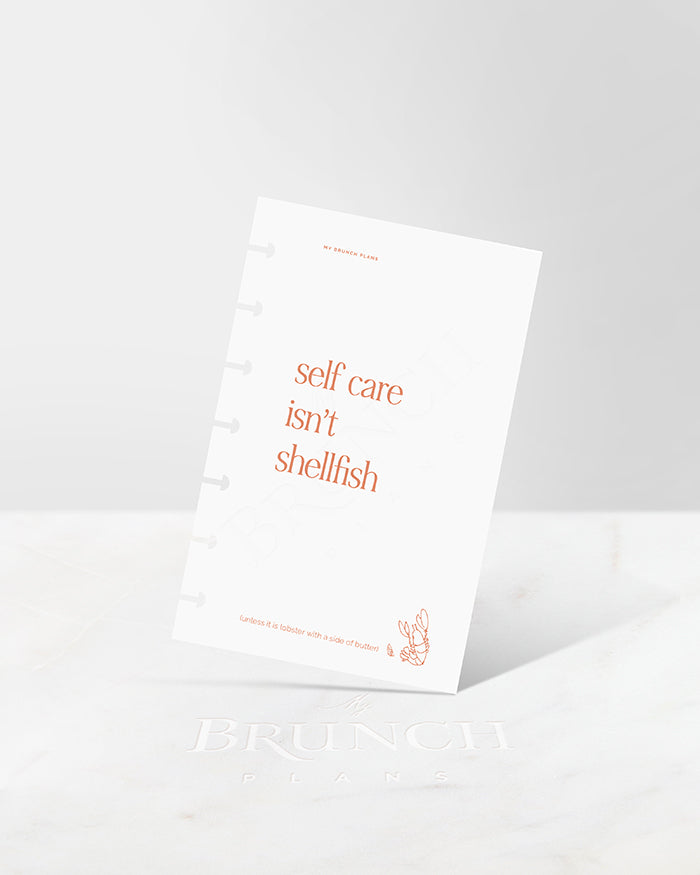 Add a splash of humor and motivation to your planner with the "Self Care Isn't Shellfish" dashboard. Playfully reminding you that taking care of yourself is essential—unless you have a lobster with a side of butter, then you better share with us, maybe. This cheeky print brings a lighthearted boost to your daily routine. Perfect for anyone who loves a laugh with their self-care, it encourages you to prioritize yourself with a smile. A fun and uplifting addition to any room, ideal for brightening your day.