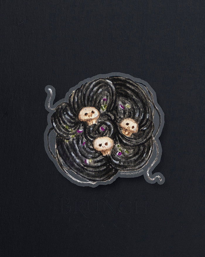 Enjoy an Halloween brunch with an entrée of squid ink pasta with toasted white button mushroom carved into skulls.